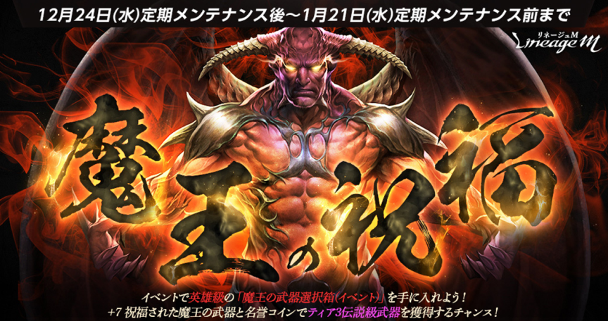 『リネージュM』伝説級武器を手に入れるチャンス!「魔王の祝福」がスタート!クリスマスイベント「サンタのクリスマスプレゼント」&「聖夜のプレゼント工場」やワールドダンジョン入場支援イベント「激闘!盟約の力を手に入れろ」などさまざまなイベントがスタート