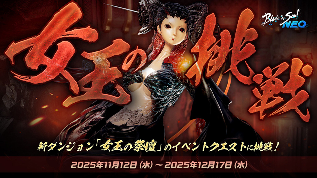 エヌ・シー・ジャパン株式会社(本社:東京都港区、代表取締役:林 元基(イム ウォンキ)、以下エヌシージャパン)は、PCオンラインゲーム『ブレイドアンドソウル』のリメイク作品となる『ブレイドアンドソウルNEO』にて、2025年11月12日(水)に、最新アップデート「女王の祭壇」の実施、およびイベント4種の開始をお知らせします。