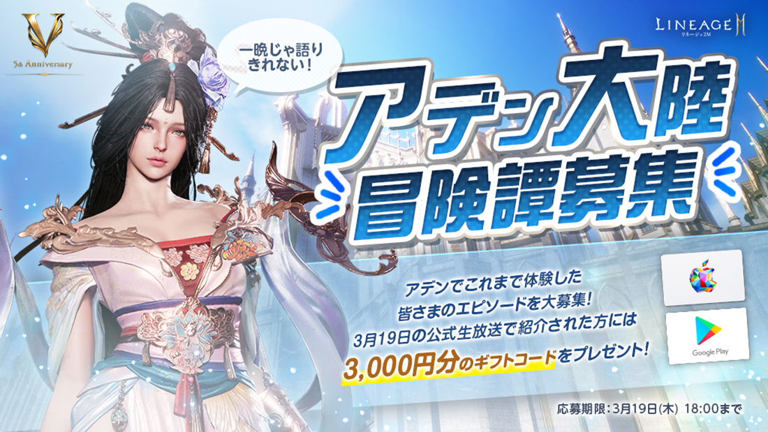 『リネージュ2M』のリリースから5年の間に起きた感動話や失敗談、面白いエピソードなど思い出を募集します。「ETERNAL BOND:飛龍結義」特設サイト内に設けられた専用のフォームよりご投稿いただき、選ばれたエピソードは3/19(木) 20時放送の公式生放送内にてご紹介します。放送内で紹介された5名様にギフトコード3,000円分をプレゼントします。