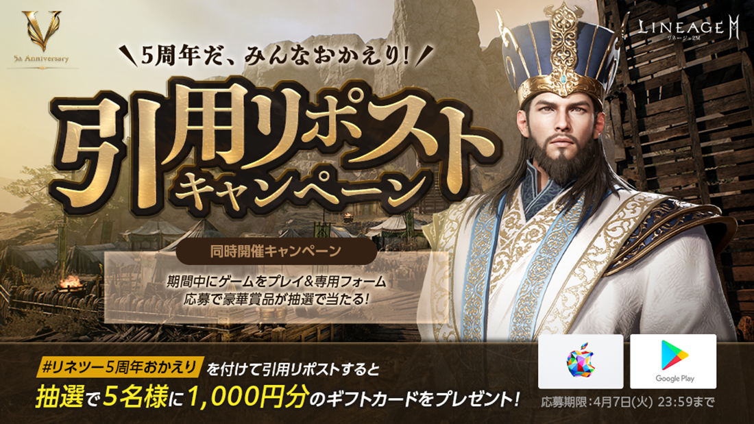期間中に、『リネージュ2M』 公式Xをフォローし、対象のキャンペーンポストにハッシュタグ「 #リネツー5周年おかえり 」をつけて引用リポストされた方の中から抽選で、5名様にApple Gift CardまたはGoogle Playギフトカード1,000円分が当たるキャンペーンを実施します。